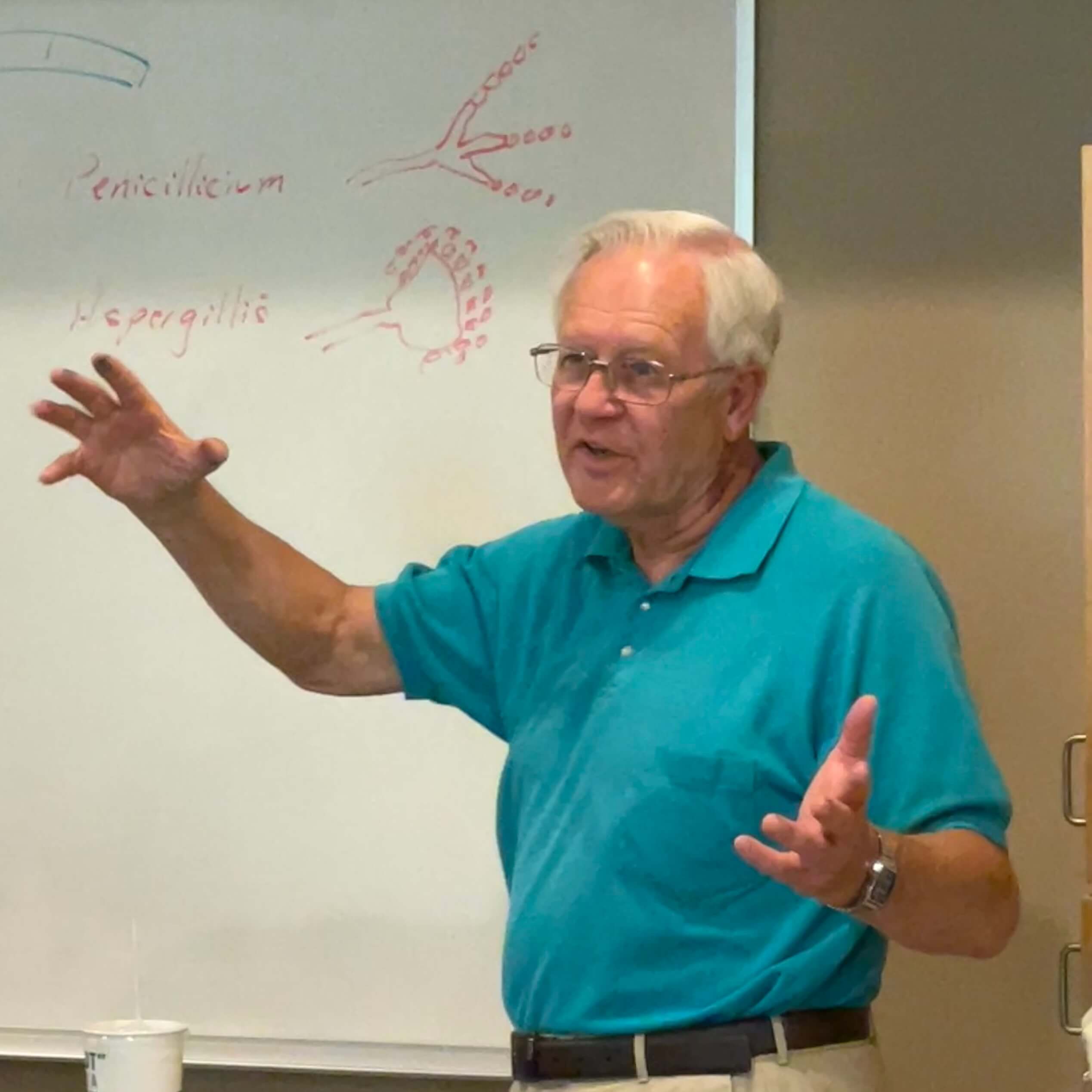 Astrobiology students studied the characteristics of life by trying to grow microbes from about a dozen different environments including pond water, yogurt, bread mold, and yeast. Dr. Ken Sosnowski, a retired microbiologist, came in to help the class identify what they grew.
