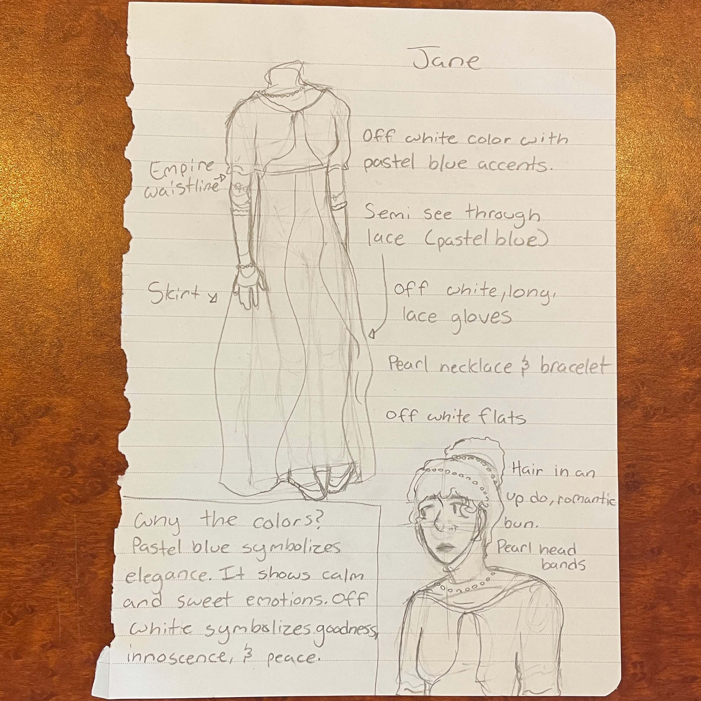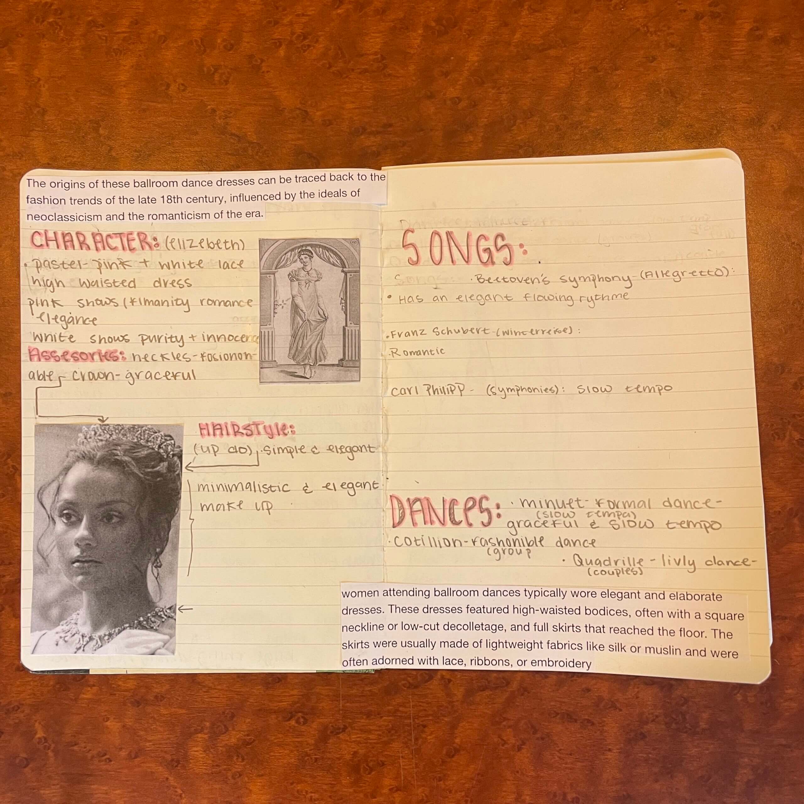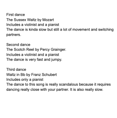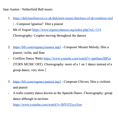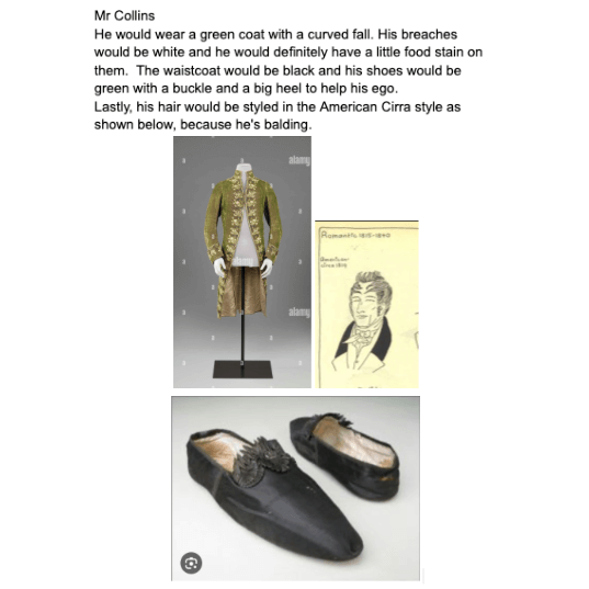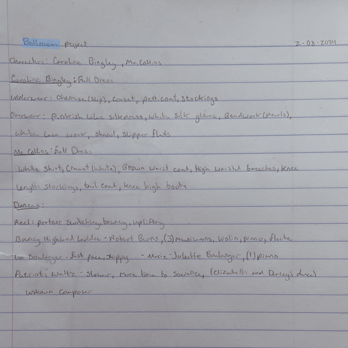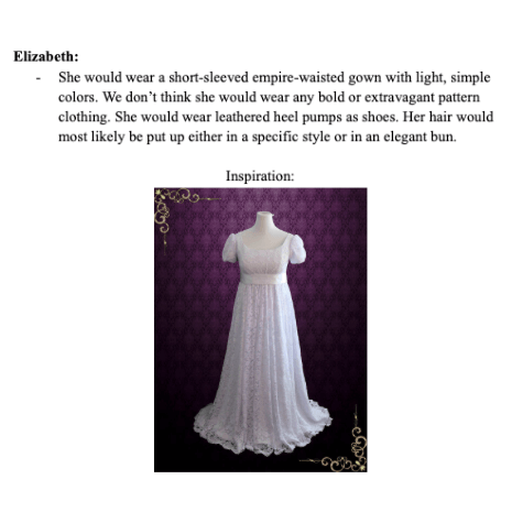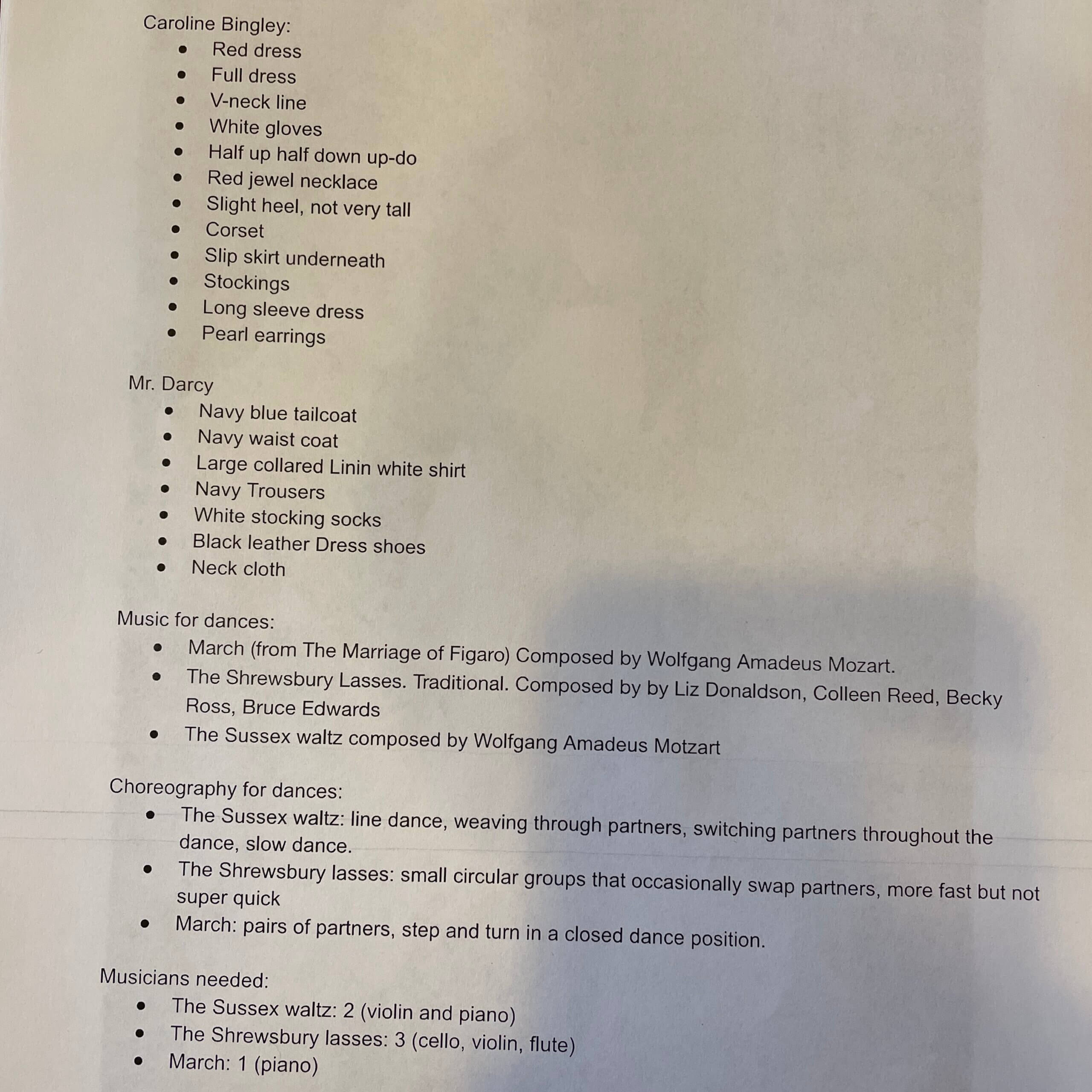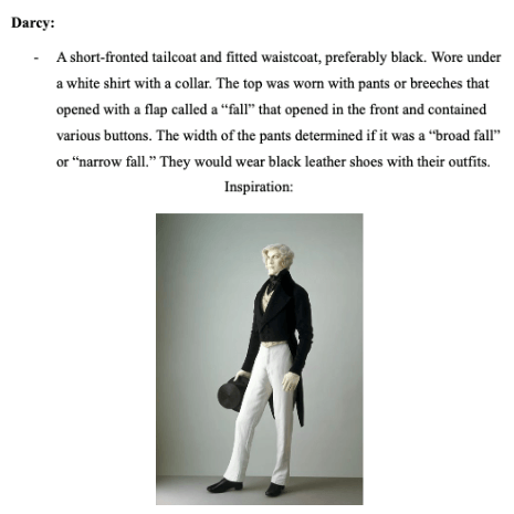After attending two balls in their reading of Pride and Prejudice, students in the Jane Austen class were tasked with choosing the wardrobe for two of the characters. They found the origins and names of various parts of the clothing they chose, and noted any significance in coloring. Next, they selected the music to be played for three dances at one of the balls. For each piece they named their composers and described the choreography.