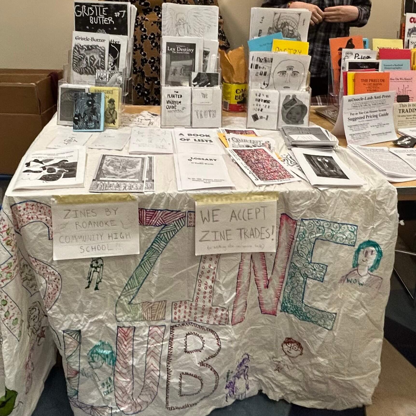 The group worked a booth to sell and trade their zines at the brand-new Blacksburg Zine Fest (officially “Art & Book Fair”).